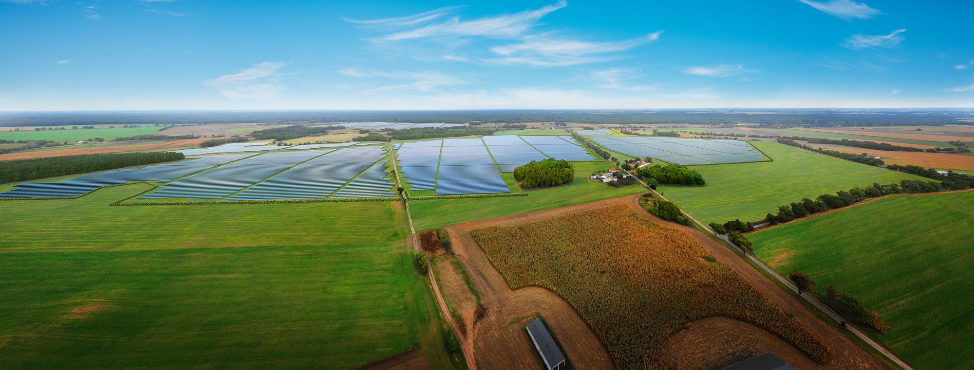 Widok na park słoneczny z lotu ptaka nad drogą Kowalskie-Karłowice od strony działek